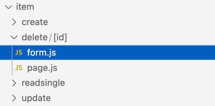 下準備ができました。次は削除ページです。deleteフォルダの[id]フォルダに、新しいファイルform.jsを作ってください。