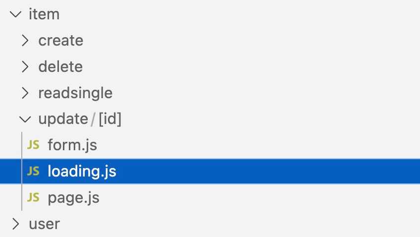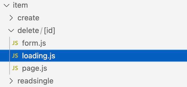 さて、Next.jsのAppルータのReactサーバーコンポーネントでは、loading.jsという名前のファイルを同じフォルダ内に作ると、それがローディングとして使われます。loading.jsを作ってください。